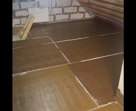 Необходимо уложить на выровненную поверхность демпферную подложку, затем мембрану, а затем еще один слой демпферной подложки, поверх которого выполняется финишное покрытие, например, ламинат.