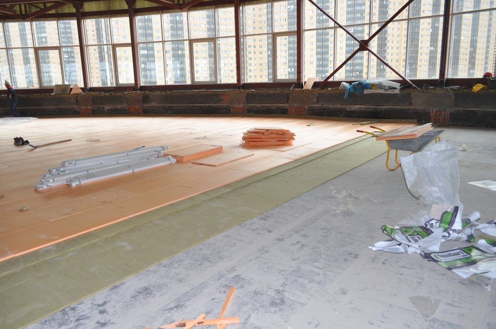 Звукоизоляция пола в фитнес клубе в районе Парнас. Перед нашей компанией стояла задача звукоизолировать пол в помещении фитнес клуба, который находится на втором этаже торгово-развлекательного центра.